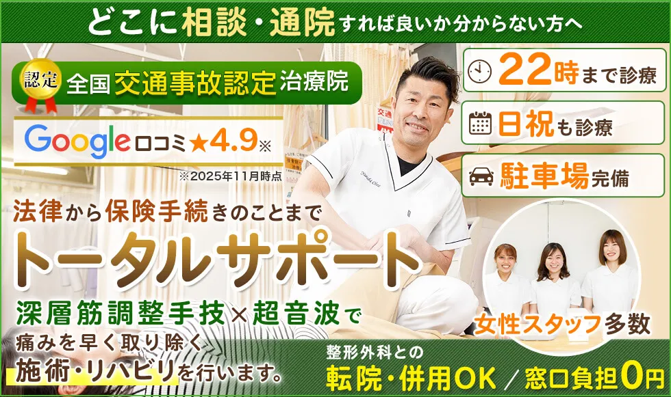 当院は平日夜22時まで・日祝まで治療が受けられる為、幅広い時間帯で交通事故治療が受けられる環境が整えられています。
